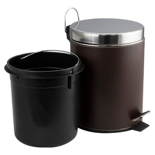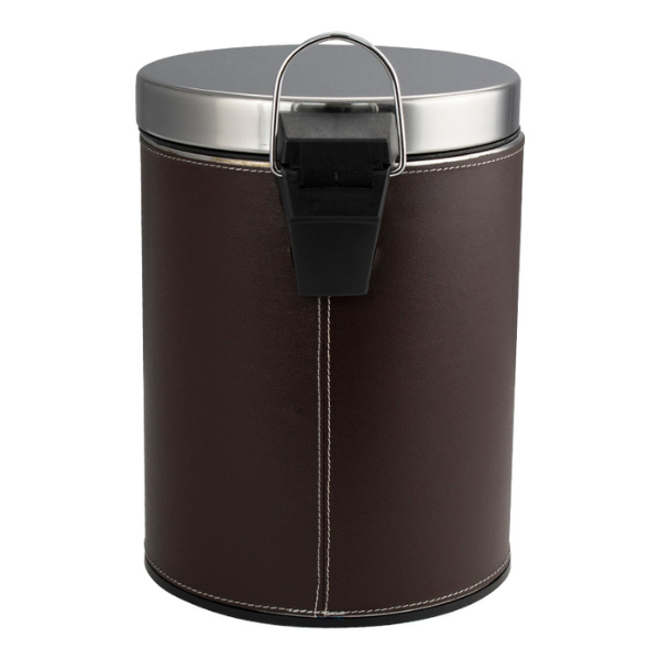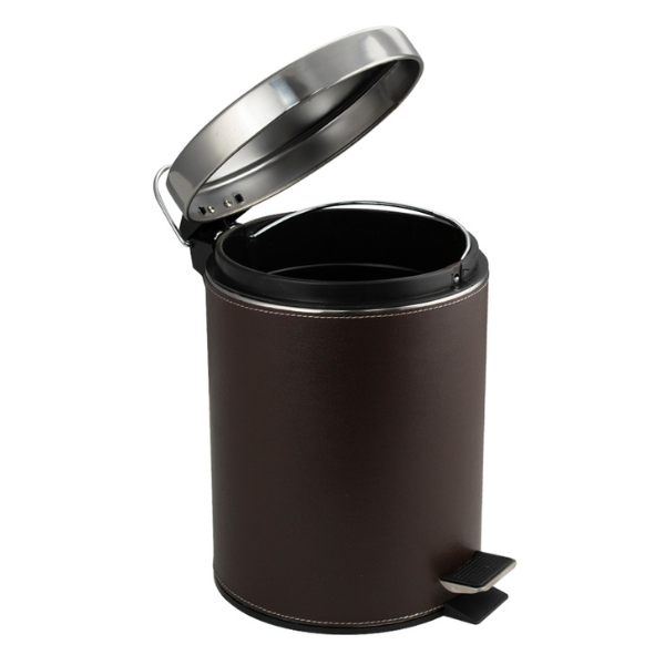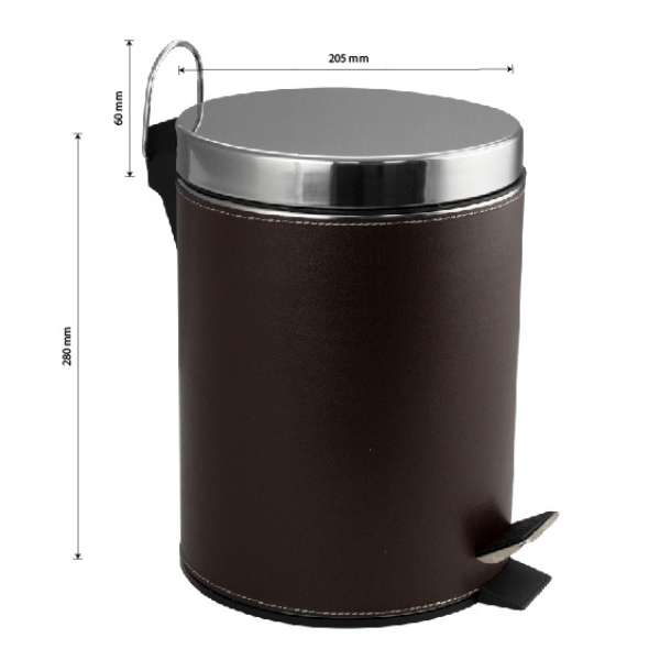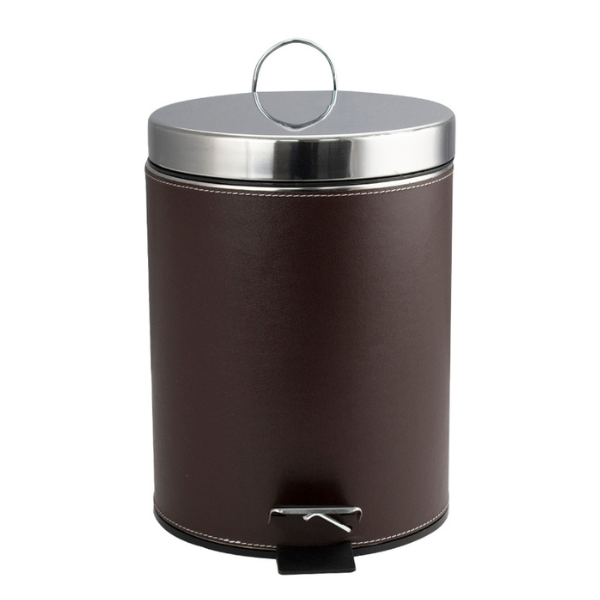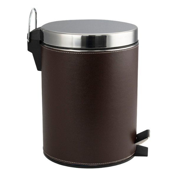 Круглое ведро с коричневыми кожаными вставками 5 л, для хранения мусора с педалью и откидной крышкой прекрасно, подойдет для ванной комнаты, туалета или кухни и офиса. Ведро оснащено пластиковым гигиеническим контейнером с металлической ручкой для переноса и механизмом поднятия крышки, при помощи нажатия на педаль. Ведро изготовлено из устойчивой к коррозии нержавеющей стали. Нескользящая пластиковая основа ведра предотвращает повреждение пола.