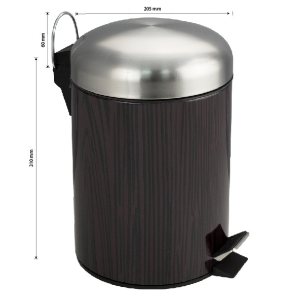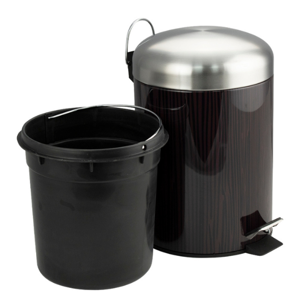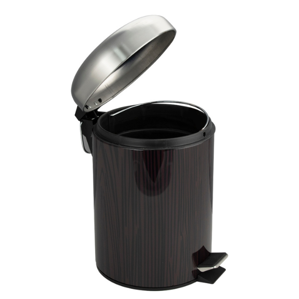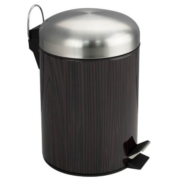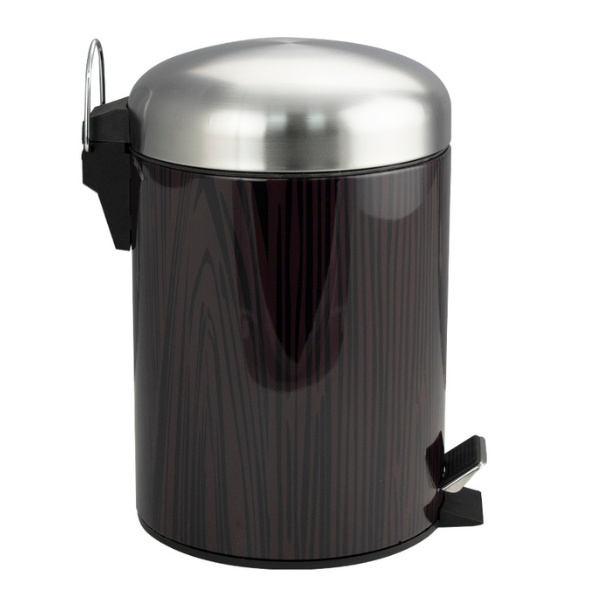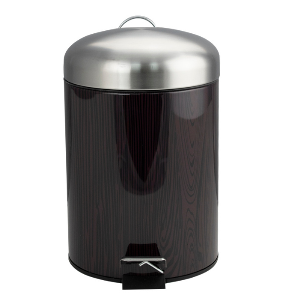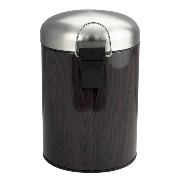 Круглое ведро с вставками под дерево 5 л, для хранения мусора с педалью и откидной крышкой прекрасно, подойдет для ванной комнаты, туалета или кухни и офиса. Ведро оснащено пластиковым гигиеническим контейнером с металлической ручкой для переноса и механизмом поднятия крышки, при помощи нажатия на педаль. Ведро изготовлено из устойчивой к коррозии нержавеющей стали. Нескользящая пластиковая основа ведра предотвращает повреждение пола.