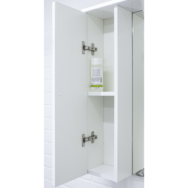 Шкаф-зеркало Лилия 55 левый АЙСБЕРГ DA2006HZ Домино в белом цвете. Корпус изготовлен из ЛДСП, а фасад из МДФ, покрыт пленкой ПВХ. На дверях установлены петли с доводчиком. Максимальная влагостойкость изделия обеспечивается за счет приклеивания кромки ПВХ высокотехнологичными полиуретановыми клеями.