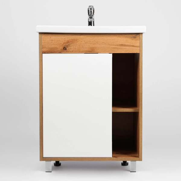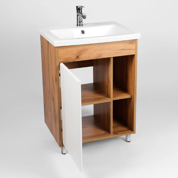 Тумба-умывальник напольная Viant Бостон VBOS50CO-T1ST с одной створкой и пространством открытого хранения укомплектована керамической раковиной Cersanit Como 50 Изготовлена в соответствии с требованиями ГОСТ 16371-93 и имеет декларацию соответствия