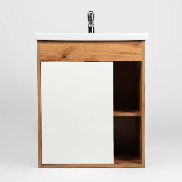Тумба-умывальник подвесная Viant Бостон VBOS50CO-T1STP с одной створкой и пространством открытого хранения укомплектована керамической раковиной Cersanit Como 50. Изготовлена в соответствии с требованиями ГОСТ 16371-93 и имеет декларацию соответствия