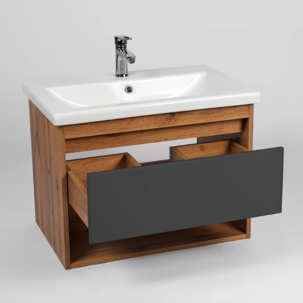 Тумба-умывальник подвесная Viant Бостон VBOS70COG-T1YP с одним выдвижным ящиком и пространством открытого хранения укомплектована керамической раковиной Cersanit Como 70. Изготовлена в соответствии с требованиями ГОСТ 16371-93 и имеет декларацию соответствия