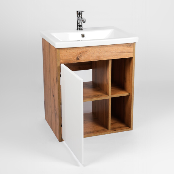 Тумба-умывальник подвесная Viant Бостон VBOS70CO-T1STP с одной створкой и пространством открытого хранения укомплектована керамической раковиной Cersanit Como 70. Изготовлена в соответствии с требованиями ГОСТ 16371-93 и имеет декларацию соответствия