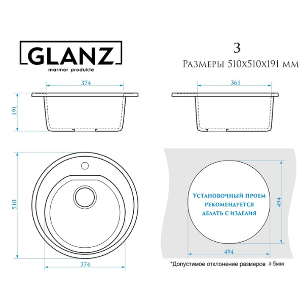 Размер монтажного отверстия под мойку: 494х494 мм