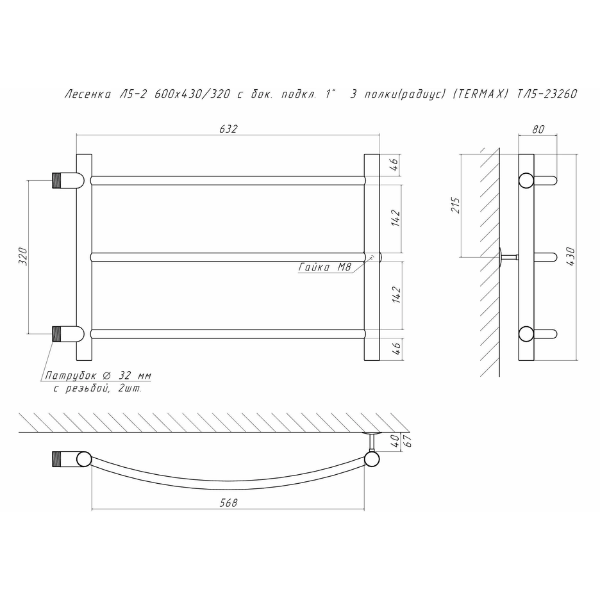 Полотенцесушитель водяной Лесенка 430х600мм 3 полки ТЛ5-23260 TERMAX с боковым подключением изготовлен из нержавеющей стали.