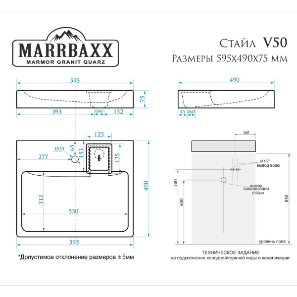 Умывальник над стиральной машиной "Стайл" V50D1 Marrbaxx изготовлен из литьевого мрамора. Раковина устанавливается на кронштейны над стиральной машиной (не допустимо монтировать на столешницу стиральной машины). В комплект входят два кронштейна, четыре закладные в раковине болт-гайка, сифон, упаковка - пятислойный белый гофрокартон и пупырчатая пленка, при необходимости обрешетка.
