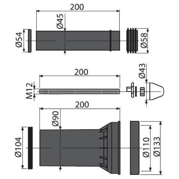 Патрубок сливной для подключения подвесного унитаза к стокам, полипропилен, Ø90 мм,с прокладками