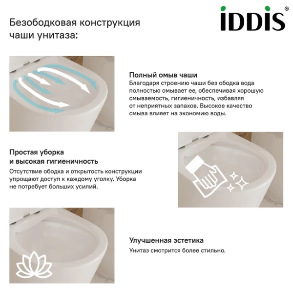 Унитаз приставной Calipso безободковый CALRDSEi26 IDDIS с тонким сиденьем из дюропласта с функцией быстрого снятия устойчивого к царапинам, надолго остается белоснежным и чистым благодаря антибактериальным свойствам материала. Высококачественная твёрдая глазурь повышает устойчивость санитарной керамики к царапинам и механическим повреждениям. Она не впитывает загрязнения, облегчая уборку, и сохраняет блеск на долгие годы. Вода полностью омывает безободковую чашу унитаза IDDIS® при смыве, избавляя от неприятных запахов. Уборка туалета не требует дополнительных усилий. Гарантия на унитазы IDDIS® – 25 лет.