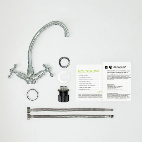 Смеситель для кухни GROSS AQUA Yota 3088039C-B03 классическое исполнение сочетает в себе комфорт и надежность в использовании. Указатели горячей и холодной воды нанесены на ручки на русском языке. Угол поворота излива 180 градусов обеспечивает охват всей рабочей зоны. Увеличенный слой никель-хромового покрытия Chrome Plus придает смесителю неизменный блеск в течение всего срока эксплуатации. Easy Fix - быстрый и легкий монтаж при помощи гайки без инструментов