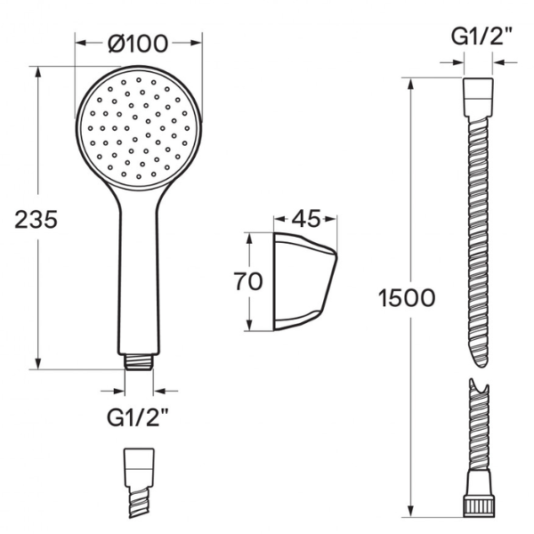 Душевой набор в комплекте: лейка диаметр 100 мм; шланг 1.5 м, настенный держатель.
