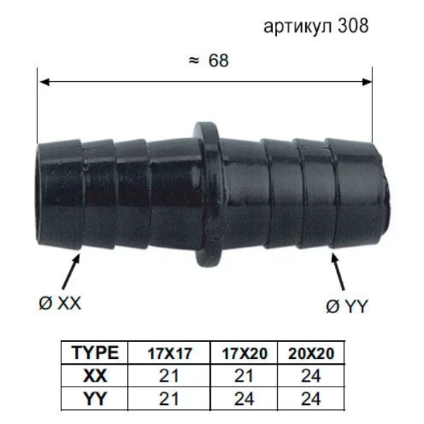 Соединитель нейлоновый для сливных шлангов 20х20 арт.308 REMER применяется для соединения двух шлангов разных диаметров между собой.