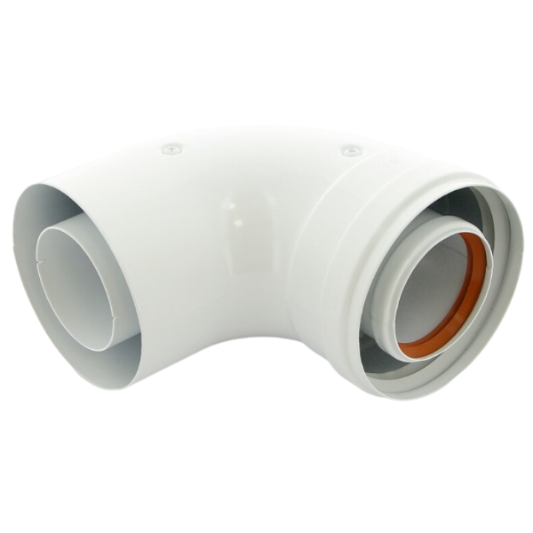Отвод коаксиальный 90гр (стартовый) Ø60/100 универсальный для настенных котлов с закрытой камерой сгорания.