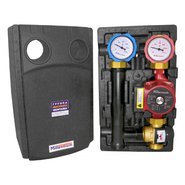 Насосная группа быстрого монтажа Dn25 с термостат. клапаном Millenium без насоса предназначена для подачи нагретого теплоносителя, поступающего из котлового контура, в контур потребителя. Подача осуществляется c возможностью добавления теплоносителя из обратной линии контура потребителя, тем сам осуществляется управление температурой теплоносителя подачи. Группы быстрого монтажа с термостатическим клапаном Wester предназначены для использования в контурах, в которых предусмотрено дополнительное регулирование температуры подачи, таких как – напольное отопление и др.