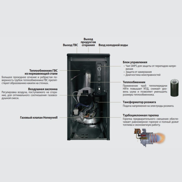 Используются в любой открытой или закрытой системе отопления, в соответствии с принципами проектирования систем отопления, а также подключаются к системе ГВС. Ассортимент двухконтурных устройств с турбоциклонной горелкой и контуром теплоносителя представлен тепловой мощностью до 35 кВт/ч. Котлы производятся в Южной Корее и соответствуют современным требованиям технических регламентов Российской Федерации.