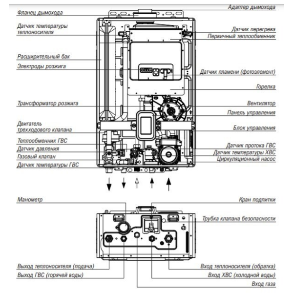Защита: автодиагностика, газ-контроль, защита от перегрева, режим предотвращения замерзания, воздухоотводчик