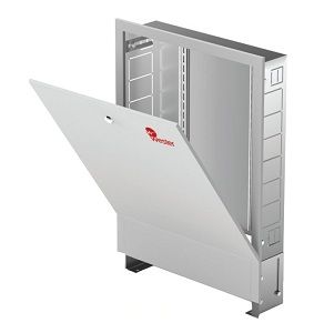 Шкаф коллекторный применяется для скрытой установки коллекторной группы и смесительного модуля водяного теплого пола. Необходимый размер шкафа и вариант установки подбирается исходя из количества контуров коллекторной группы и размеров смесительного модуля.