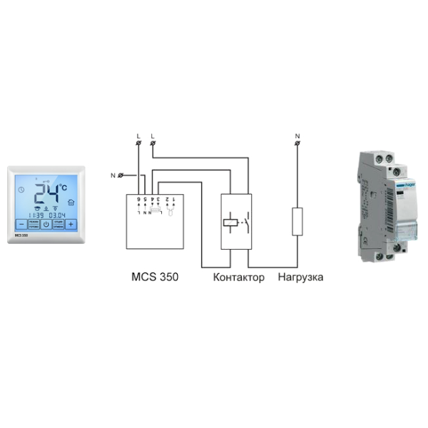 Такая схема является типовой для управления котлами, мощными радиаторами, большими группами систем кабельного обогрева и другими потребителями. Для подключения терморегулятора Теплолюкс MCS 350 TUYA к электроприборам мощностью более 3,5 кВт можно использовать низковольтное оборудование немецкого концерна HAGER, например, 1-полюсный контактор ESC125 на 25 А. Терморегулятор Теплолюкс MCS 350 TUYA и приложение для мобильных устройств TUYA можно также использовать для управления системами водяного теплого пола.