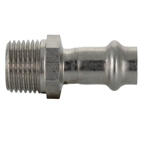 Пресс-соединение – бесштуцерное; обжатие производится с помощью пресс-инструмента V-профиля. Резьба противоположного патрубка имеет насечки – для эффективного удержания уплотняющего материала. Шестигранный – под гаечный ключ – участок корпуса облегчает монтаж соединения.