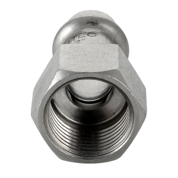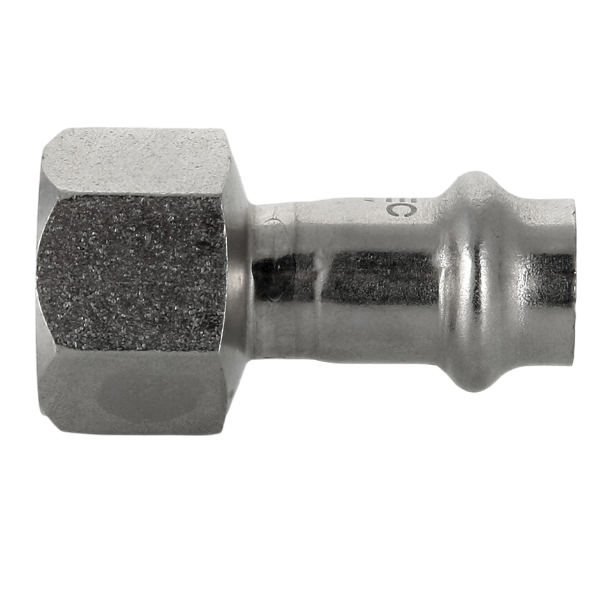 Пресс-соединение – бесштуцерное; обжатие производится с помощью пресс-инструмента V-профиля. Шестигранный – под гаечный ключ – участок корпуса облегчает монтаж резьбового соединения.