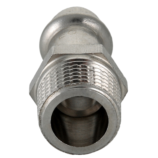 Пресс-соединение – бесштуцерное; обжатие производится с помощью пресс-инструмента V-профиля. Резьба противоположного патрубка имеет насечки – для эффективного удержания уплотняющего материала. Шестигранный – под гаечный ключ – участок корпуса облегчает монтаж соединения.