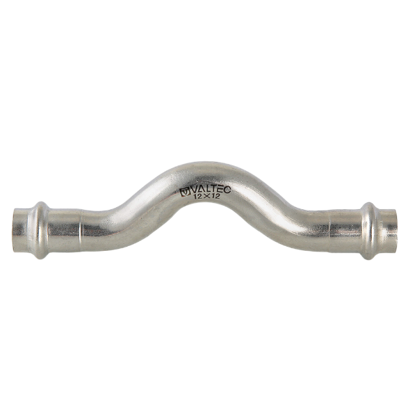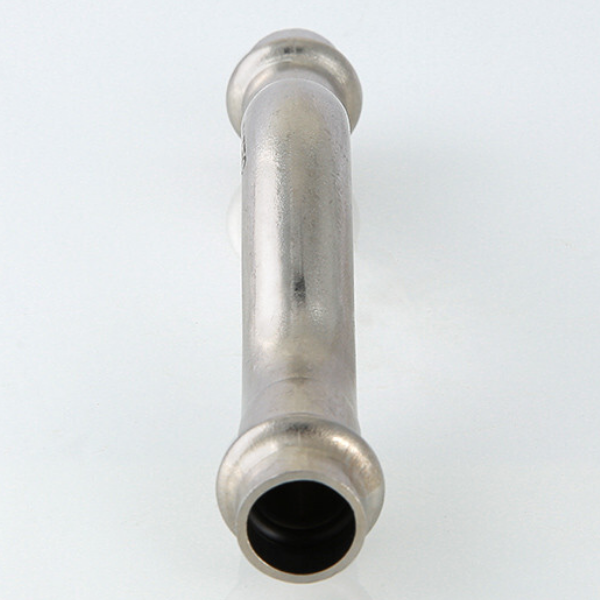 Двухраструбный обвод из нержавеющей стали (VTi.971.I) применяется для соединения тонкостенных стальных труб в системах водоснабжения, отопления, других инженерных и технологических установках с рабочей температурой до 120 °С. Номинальное давление – 16 бар. Достоинством бесштуцерных соединителей является малый коэффициент местного сопротивления (сужение канала практически отсутствует). Фитинг рассчитан на обжатие с помощью пресс-инструмента V-профиля.