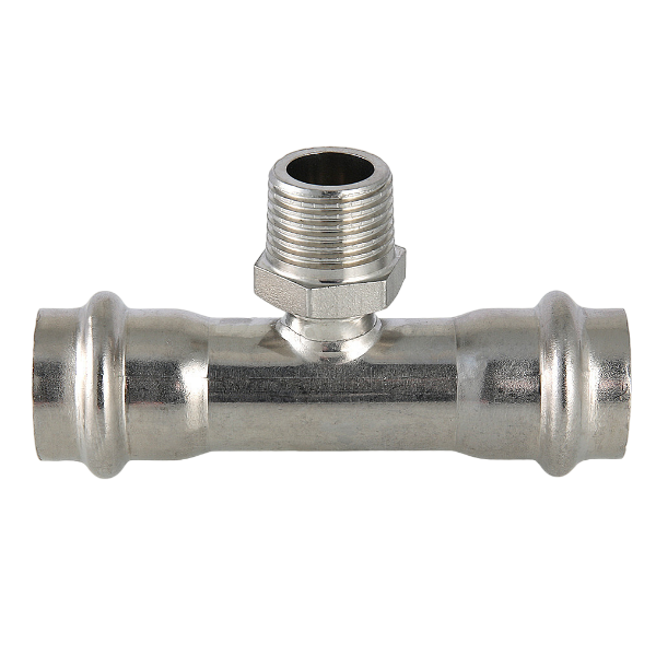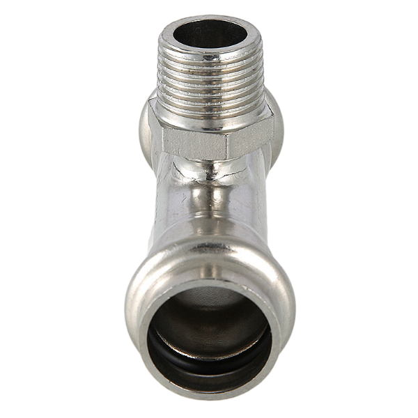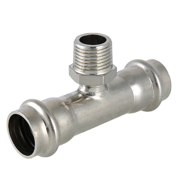 Пресс-тройник из нержавеющей стали с наружной резьбой (VTi.933.I) применяется для соединения тонкостенных стальных труб с резьбовым элементом системы водоснабжения, отопления, других инженерных и технологических установок. Фитинг рассчитан на эксплуатацию при максимальной рабочей температуре 120 °С. Номинальное давление – 16 бар.