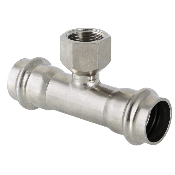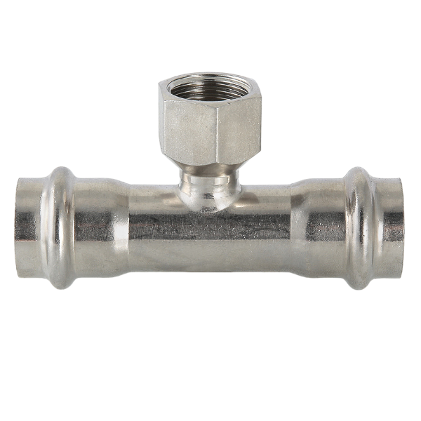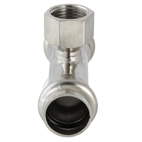 Пресс-тройник из нержавеющей стали с внутренней резьбой (VTi.932.I) применяется для соединения тонкостенных стальных труб с резьбовым элементом системы водоснабжения, отопления, других инженерных и технологических установок. Фитинг рассчитан на эксплуатацию при максимальной рабочей температуре 120 °С. Номинальное давление – 16 бар.