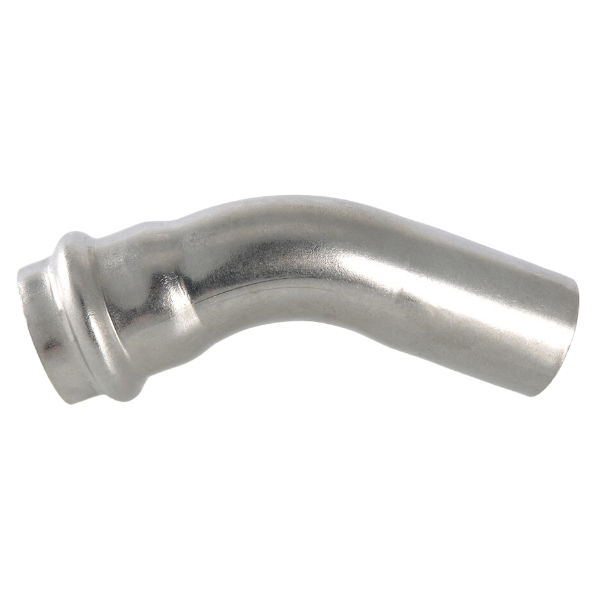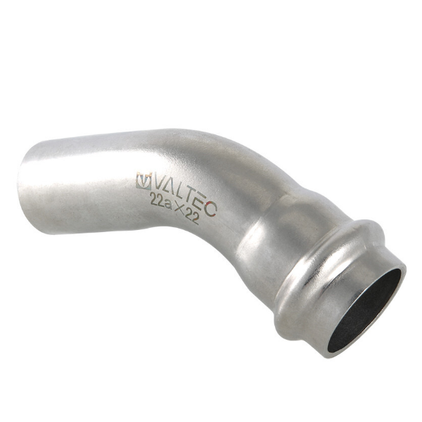 Однораструбный пресс-угольник 45° из нержавеющей стали (VTi.958.I) обеспечивает соединение тонкостенных стальных труб систем водоснабжения, отопления, иных инженерных и технологических установок с рабочей температурой до 120 °С и давлением до 16 бар. Благодаря бесштуцерной конструкции соединитель обладает малым коэффициентом местного сопротивления – сужение канала практически отсутствует. Фитинг рассчитан на обжатие с помощью пресс-инструмента V-профиля.