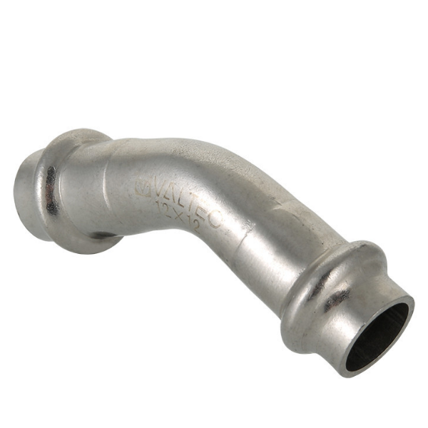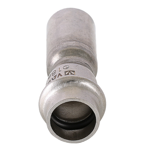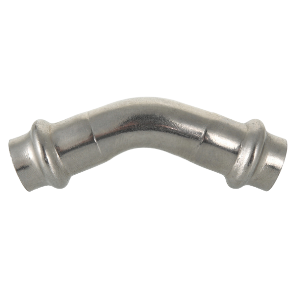 Двухраструбный пресс-угольник 45° из нержавеющей стали (VTi.951.I) обеспечивает соединение тонкостенных стальных труб систем водоснабжения, отопления, иных инженерных и технологических установок с рабочей температурой до 120 °С и давлением до 16 бар. Благодаря бесштуцерной конструкции соединитель обладает малым коэффициентом местного сопротивления – сужение канала практически отсутствует. Фитинг рассчитан на обжатие с помощью пресс-инструмента V-профиля.