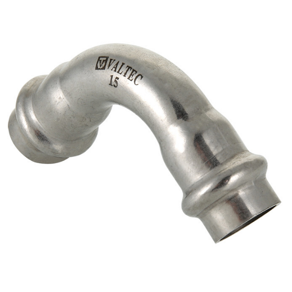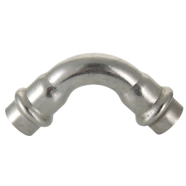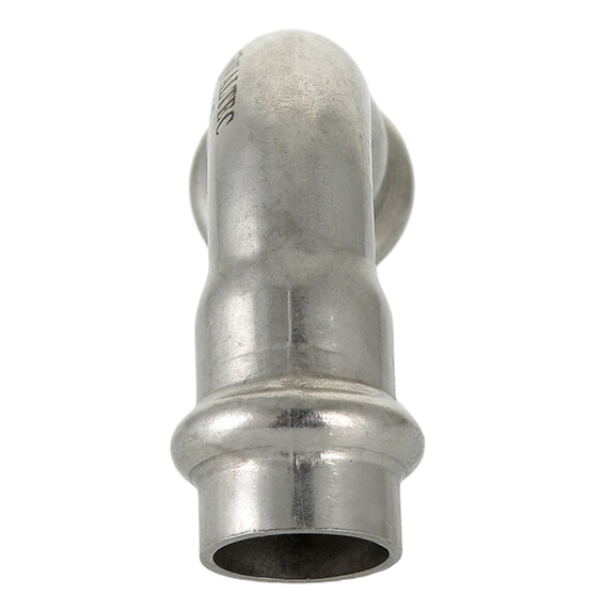 Двухраструбный пресс-угольник 90° из нержавеющей стали (VTi.951.I) обеспечивает соединение тонкостенных стальных труб систем водоснабжения, отопления, иных инженерных и технологических установок с рабочей температурой до 120 °С и давлением до 16 бар. Благодаря бесштуцерной конструкции соединитель обладает малым коэффициентом местного сопротивления – сужение канала практически отсутствует. Фитинг рассчитан на обжатие с помощью пресс-инструмента V-профиля.