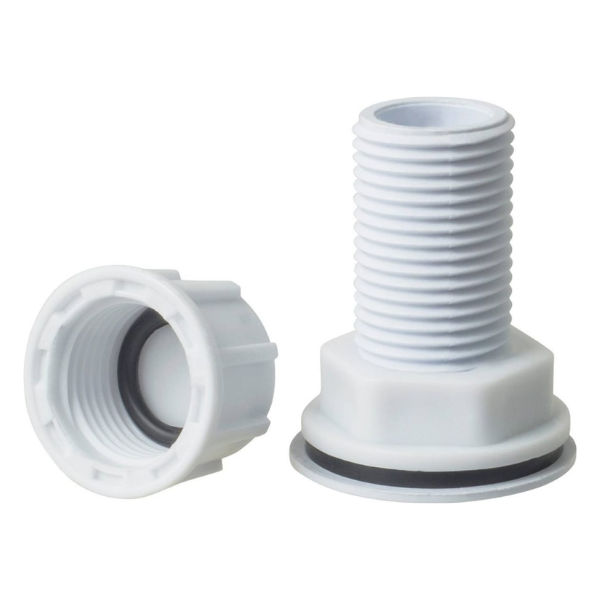 Врезка, штуцер в бак с прокладкой служит для соединения резьбовых фитингов и устройств с корпусом необходимой пластиковой емкости (бака). Врезка для бака в сборе: грибок, прокладки, гайка.
