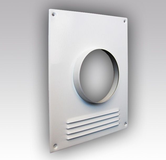 Площадка торцевая металлическая ПТМР с решеткой с покрытием полимерной белой эмалью. Используется для крепления круглых воздуховодов к каналу дымохода от различного газового оборудования.