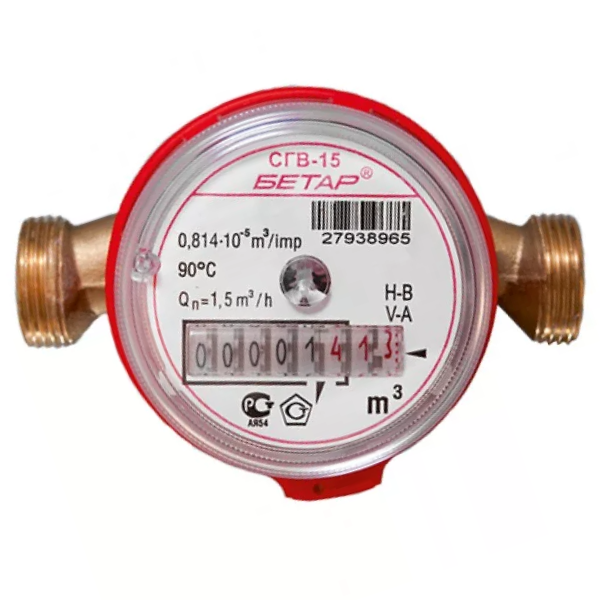 Счетчик воды универсальный СГВ-15 Ду15 90°С L=110 мм (без монтажного комплекта) Бетар применяется для измерения объема холодной и горячей питьевой воды, протекающей по трубопроводу при температуре от плюс 5°C до плюс 40 °С для счетчиков холодной воды (СХВ) и от плюс 5°C до плюс 90 °С для счетчиков горячей воды (СГВ) при давлении не более 1,0 МПа (10 кгс/см2). Счетчик типа СГВ в силу своей универсальности и применения одинаковых термостойких материалов могут быть использованы для измерения объема, как холодной, так и горячей воды.