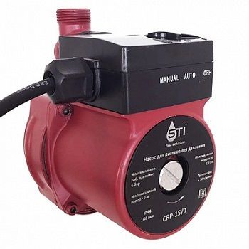 Насос для повышения давления STI CRP 15/9 применяется для повышения давления в существующей системе водоснабжения. Используются в сети водоснабжения для повышения напора воды в душе или в других точках водоразбора, перед водонагревателями (газовые колонки, проточные водонагреватели, двухконтурные котлы), стиральными и посудомоечными машинами Преимуществами повысительных насосов STI являются: малые габариты; установка непосредственно на трубопроводе; бесшумная работа большой срок эксплуатации; удобный монтаж. Насос состоит из гидравлической части и электродвигателя. Ротор электродвигателя располагается непосредственно в перекачиваемой среде, ротор от статора отделяет гильза из нержавеющей стали. Подшипники смазываются и охлаждаются перекачиваемой жидкостью. У насоса для повышения давления STI есть следующие режимы работы: MANUAL - насос работает постоянно, пока включен в розетку; AUTO - насос автоматически запускается/отключается при открытии крана (вентиля); OFF - насос не работает. Обмотки электродвигателя снабжены защитой полного сопротивления. Имеется подключение для заземления наружного корпуса насоса.