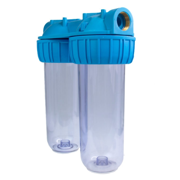 Фильтр магистральный ITA-25-3/4 для очистки воды (двойной) применяется для комбинированной очистки холодной воды от механических частиц: ржавчины, песка, окалины, ила; снижает цветность и мутность воды, а также дополнительной очистки, например, от растворенного железа или солей жесткости (при использовании соответствующего сменного картриджа). Колбы «ИТА-25» изготовлены из ударопрочного прозрачного полипропилена по итальянской технологии. Фильтр оснащен воздушными клапанами сброса давления; изготавливается с усиленными латунными резьбовыми вставками. Применяется специальная упорная резьба, способная выдерживать резкие перепады давления. Наружное расположение уплотнительного кольца дает возможность 100% герметичного прилегания оголовка и колбы фильтра в двух плоскостях (оголовок + обжимное кольцо). Монолитный коллектор позволяет избежать аварийных протечек воды