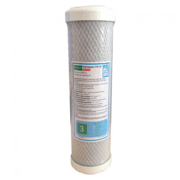 Картридж CTO-10 ПРЕМИУМ (карбон-блок) F30511 ITA предназначен для фильтрования воды, обладает дезинфицирующими свойствами. Корректирует вкус, цвет, запах воды. Удаляет ионы тяжелых металлов, нефтепродукты, токсичные загрязнения.