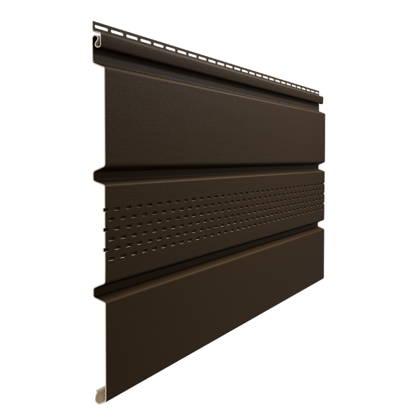 Софит Docke STANDARD с центральной перфорацией (Шоколад) 3м PSSF-1050 Docke применяется для подшивки карнизных свесов в тех случаях, когда важно минимизировать теплопотери и обеспечить вентиляцию кровли.