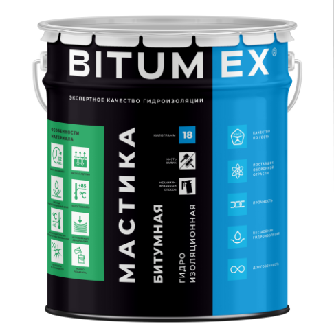 Мастика битумная гидроизоляционная BITUMEX предназначена для обмазочной гидроизоляции бетонных, железобетонных, деревянных и других строительных конструкций снаружи помещения. Гидроизоляции фундамента, приклеивании рулонных материалов (рубероид) на битумной основе с пылевидной посыпкой, устройство пароизоляционного слоя в конструкциях плоских кровель.