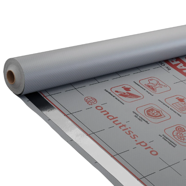 Двухслойная гидроизоляционная плёнка Ондутис Смарт D серого цвета с интегрированной клеящей лентой для защиты неутеплённых кровель с металлическим или иным покрытием, полов влажных помещений, утеплённых цокольных перекрытий, а также для пароизоляции зданий. Значительно снижает риск образования наледи и сосулек, отводя тепловой поток от кровли.
