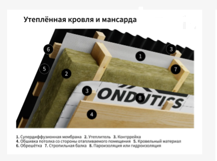 Двухслойная плёнка Ондутис Смарт В с исключительно низкой паропроницаемостью и отличной водоупорностью, которая обеспечивает защиту утеплителя от паров изнутри помещения.