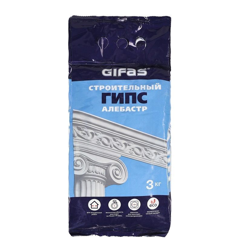 Гипс строительный (алебастр) Г-4 Gifas. Применяется в отделочных, ремонтных, интерьерных, электромонтажных работах внутри помещений с нормальным уровнем влажности.