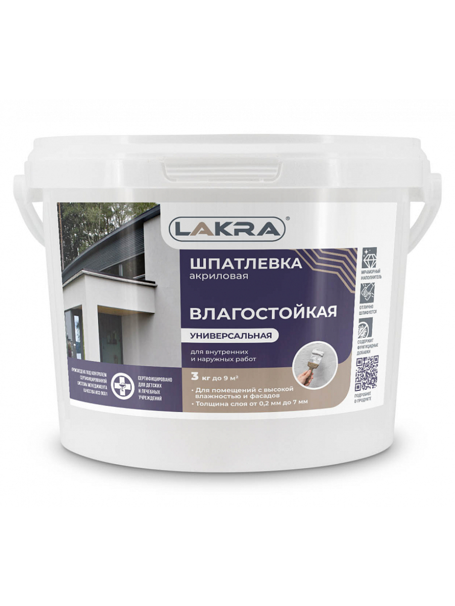 Шпаклевка акриловая универсальная для внутренних и наружных работ 3кг Лакра на основе водной дисперсии акрилового сополимера, имеет высокую адгезию к основанию, стойкость к растрескиванию и малую усадку. После высыхания отлично шлифуется. Применяется для выравнивания стен и потолков внутри и снаружи помещений. Допускается использование на фасадах, при условии грунтования и последующей окраски фасадными материалами. Используется по кирпичу, бетону, штукатурке и другим минеральным поверхностям.