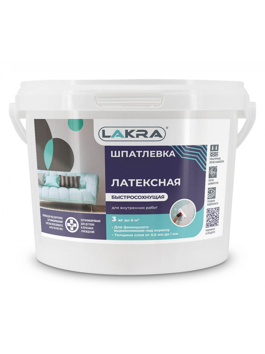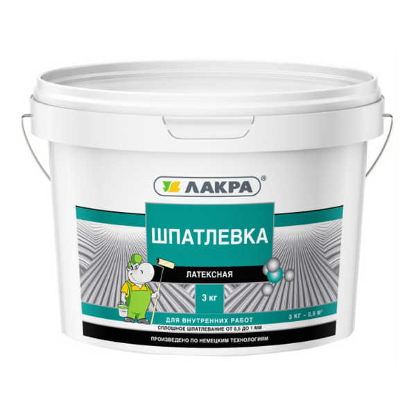 Шпаклевка латексная для внутренних работ 3кг Лакра на основе водной дисперсии акрилового латекса, имеет высокую адгезию к основанию и малую усадку. После высыхания отлично шлифуется. Содержит фунгицидные добавки, препятствующие появлению грибков. Применяется для финишного выравнивания стен и потолков внутри сухих помещений. Используется по бетонным, асбоцементным и оштукатуренным поверхностям, в том числе заделки стыков и щелей гипсокартонных листов с применением армирующих материалов, затирки трещин и проведения подготовительных работ под различные виды внутренних малярных работ и оклейку обоев.