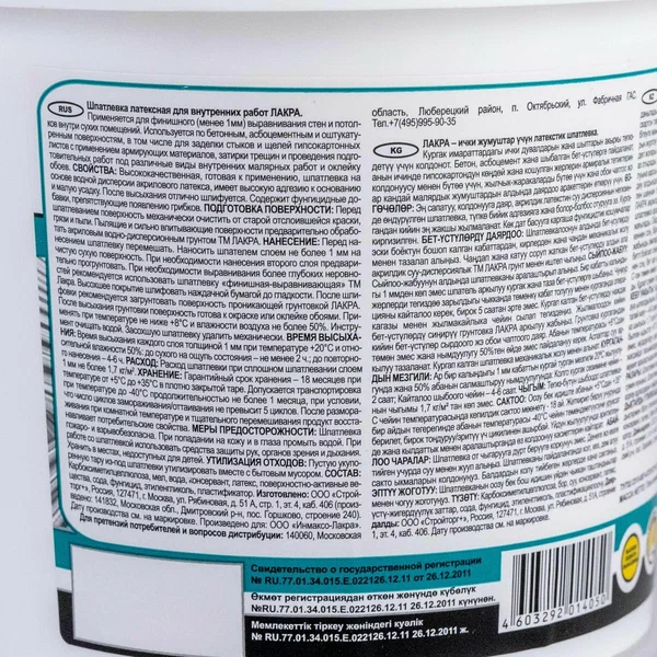 Состав: карбоксиметилцеллюлоза, мел, вода, консервант, латекс, поверхностноактивные вещества, сода, фунгицид, этиленгликоль, пластификатор.