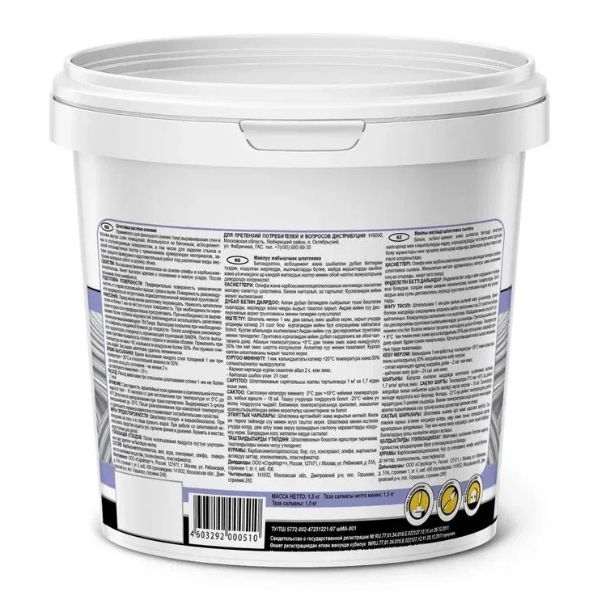 Состав: карбоксиметилцеллюлоза, мел, мыло, вода, консервант, олифа, поверхностноактивные вещества, этиленгликоль, пластификатор.