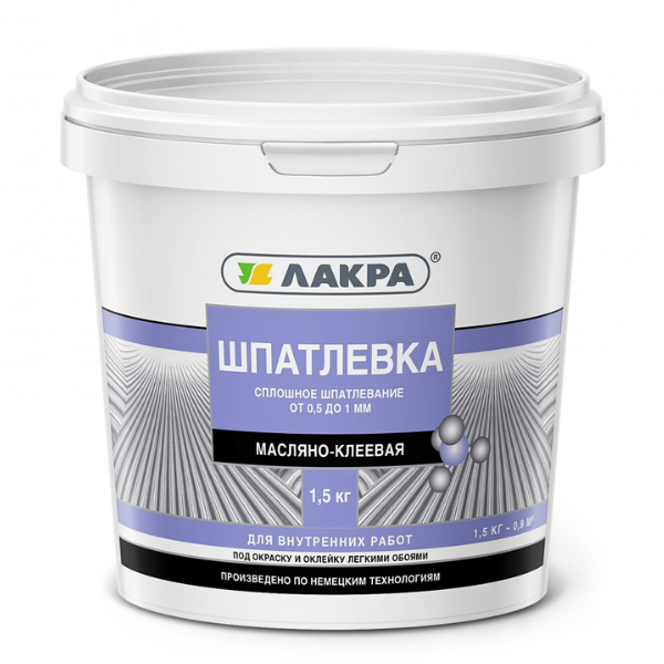 Шпаклевка маслянно-клеевая 1,5кг Лакра для сухих помещений на основе олифы. Имеет высокую адгезию к основанию и малую усадку, легко шлифуется. Применяется для выравнивания бетонных, асбоцементных и оштукатуренных поверхностей, заделки стыков и щелей, затирки трещин и проведения подготовительных работ под различные виды внутренних малярных работ и под оклейку обоями.
