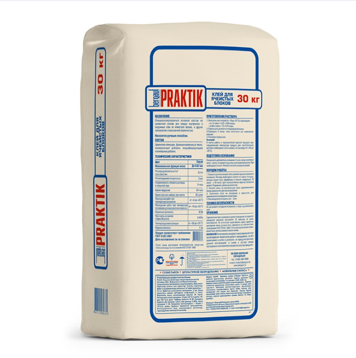 Клей для блоков Bergauf Praktik сухая строительная смесь применяется для тонкошовной кладки стен и перегородок из блоков и плит на основе ячеистых бетонов (в том числе газобетонов), при температуре от + 5°С до + 25°С.