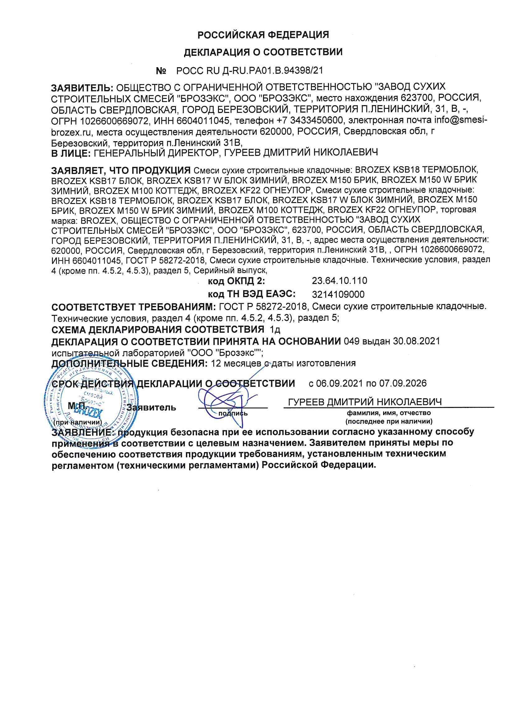 Смесь кладочная Брозекс М-150 Брик высокопрочная применяется для внутренних и наружных работ при проведении кладочных работ из пустотелого и полнотелого кирпича, бетонных камней и натурального камня; для монтажа стен из крупных бетонных блоков и панелей; для заполнения горизонтальных и вертикальных швов в стенах из панелей и крупных бетонных блоков и устранения сколов и других дефектов бетонных поверхностей при температуре до -15°С.