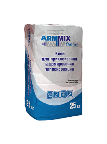 ArmMix fasad - Клей для приклеивания и армирования теплоизоляции – сухая строительная смесь состоящая из цемента, фракционированного песка и специальных модифицирующих добавок. Смесь Предназначена для приклеивания плит утеплителя из всех видов пенополистирола и минеральной ваты, а также для создания базового армирующего слоя при монтаже теплоизоляционной системы. Обладает высокой адгезией к теплоизоляции и к основным видам строительных оснований (бетон, газобетон, цементная штукатурка и т.д.). Используется для наружных и внутренних работ, при температуре от + 5°С до + 30°С.