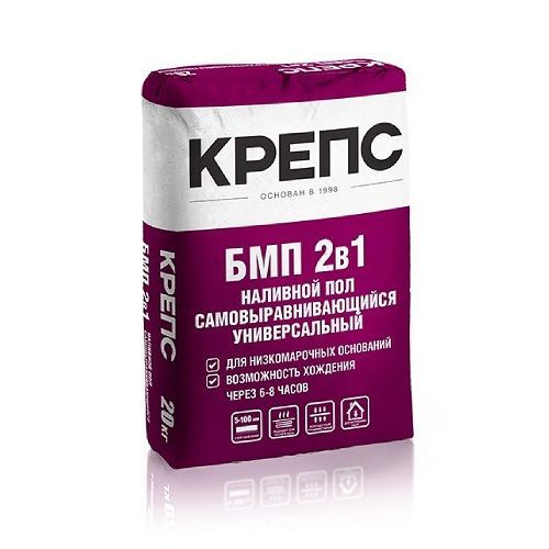 Самовыравнивающийся наливной пол КРЕПС "БМП 2в1" – высокомодифицированная сухая выравнивающая напольная смесь наливного типа на основе комплексного вяжущего и фракционированного песка. Обладает трещиностойкостью и быстрым набором прочности.